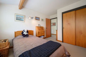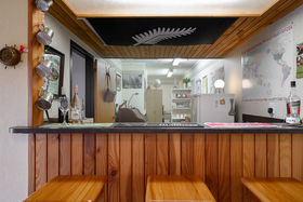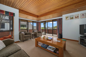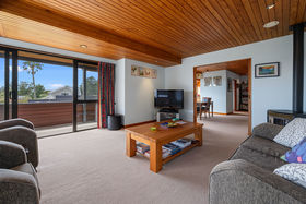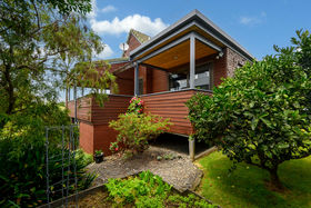 Enter the foyer mid-level. Take a short flight of stairs up to the main living areas, or one down to garaging and a surprising amount of versatile space on the ground floor. The upper level spans a tidy well-equipped kitchen with servery to the large dining room, then cavity sliding doors to the spacious lounge. The surrounding, mainly covered, deck extends to the master suite and provides outdoor escapes in all weathers. A second large bedroom, family bathroom and separate toilet along the west side with steps linking the laundry to the garden below.